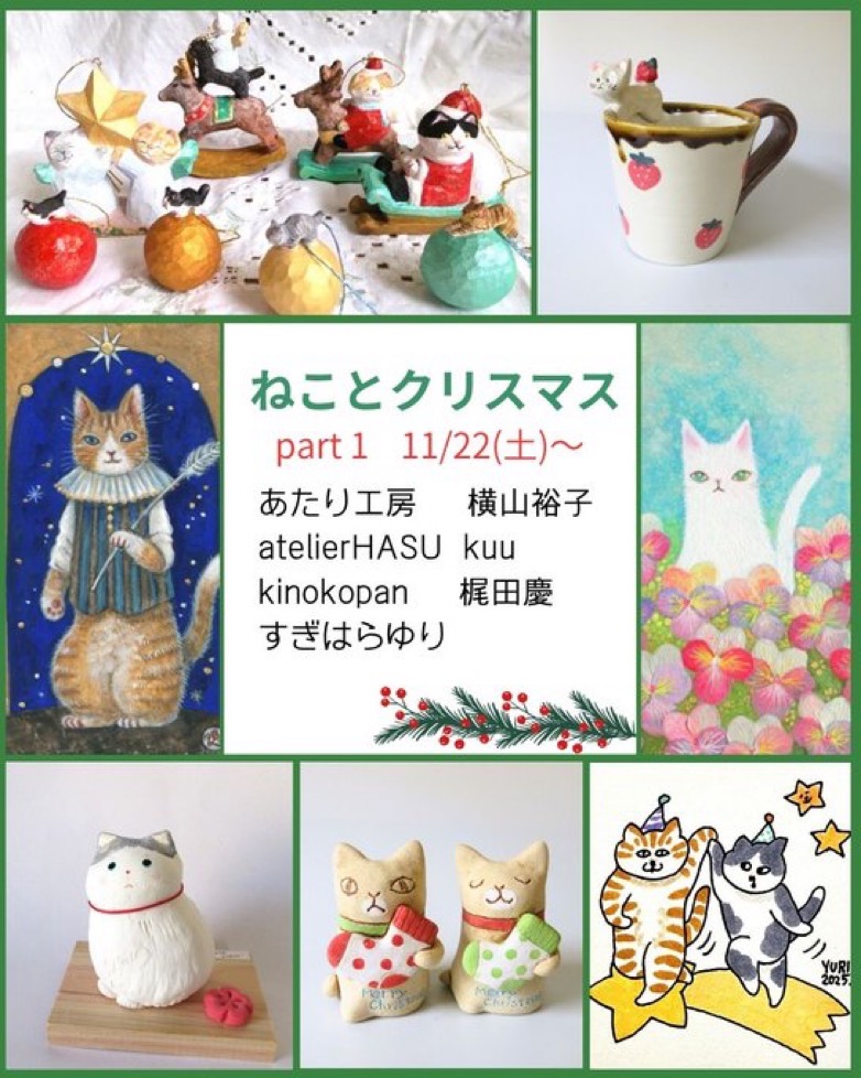 ねことクリスマス展 日時:2025年 11月22日〜30日 10:00〜16:00 水曜&木曜 定休 イベント出店で臨時休業有 要確認 場所:コーヒー豆と雑貨の店 豆ねこ