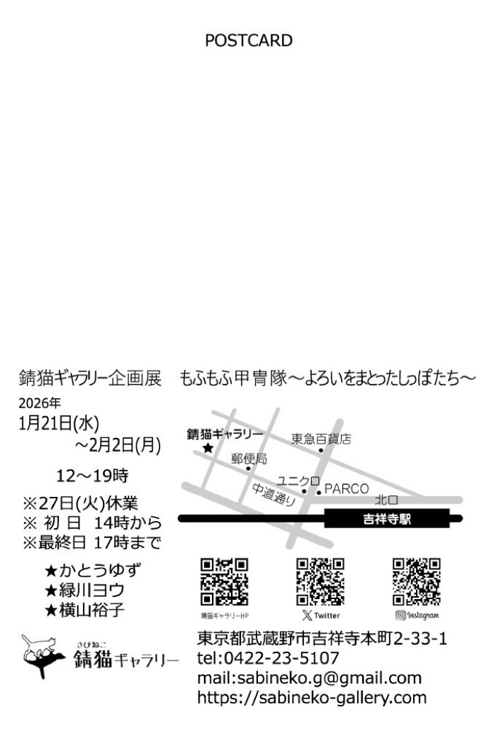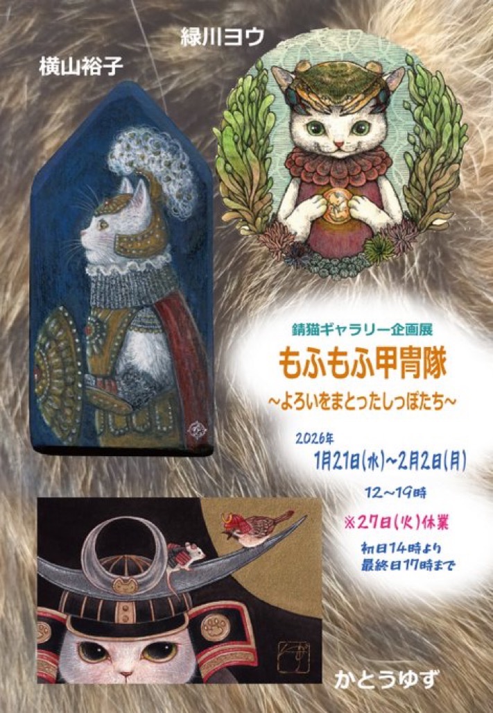 もふもふ甲冑隊 鎧や兜を描きたい!!という発言から実現した 企画展です。 私も描けるかドキドキですが、西洋風甲冑でこの試みに挑戦いたします。 日時:2026年1月21日(水)〜2月2日(月) 12:00〜18:00 火曜定休 初日14:00〜 最終日17:00まで 場所:吉祥寺 錆猫ギャラリー