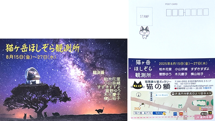猫ヶ岳ほしぞら観測所展 猫の額さん企画で星空テーマのものは好きなのでついついお誘い受けてしまいます。 日時:2025年 8月15日(金)〜27日(水) 12:00〜20:00 木曜定休 場所:高円寺 猫の額