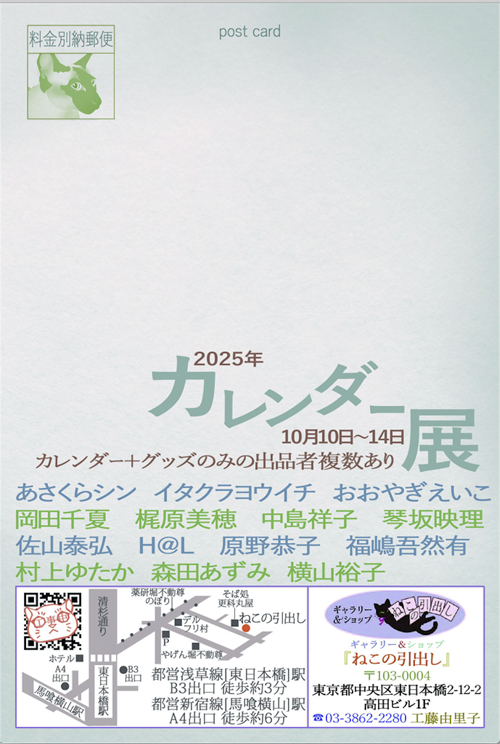 場所:東日本橋 ねこの引出し 2025年のカレンダー、原画 それ以外・・・雑貨などでの参加予定です。