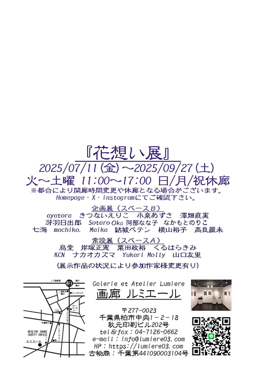 花がテーマの展示です 猫と花とか女の子とかの作品をイメージしています。 千葉 柏市中央1丁目2ー18秋元印刷ビル202 日時:2025年 7月〜9月 火〜土曜日 11:00〜17:00 日月祝休廊 場所:千葉県柏市 Galerie Lumiere ギャラリールミエール